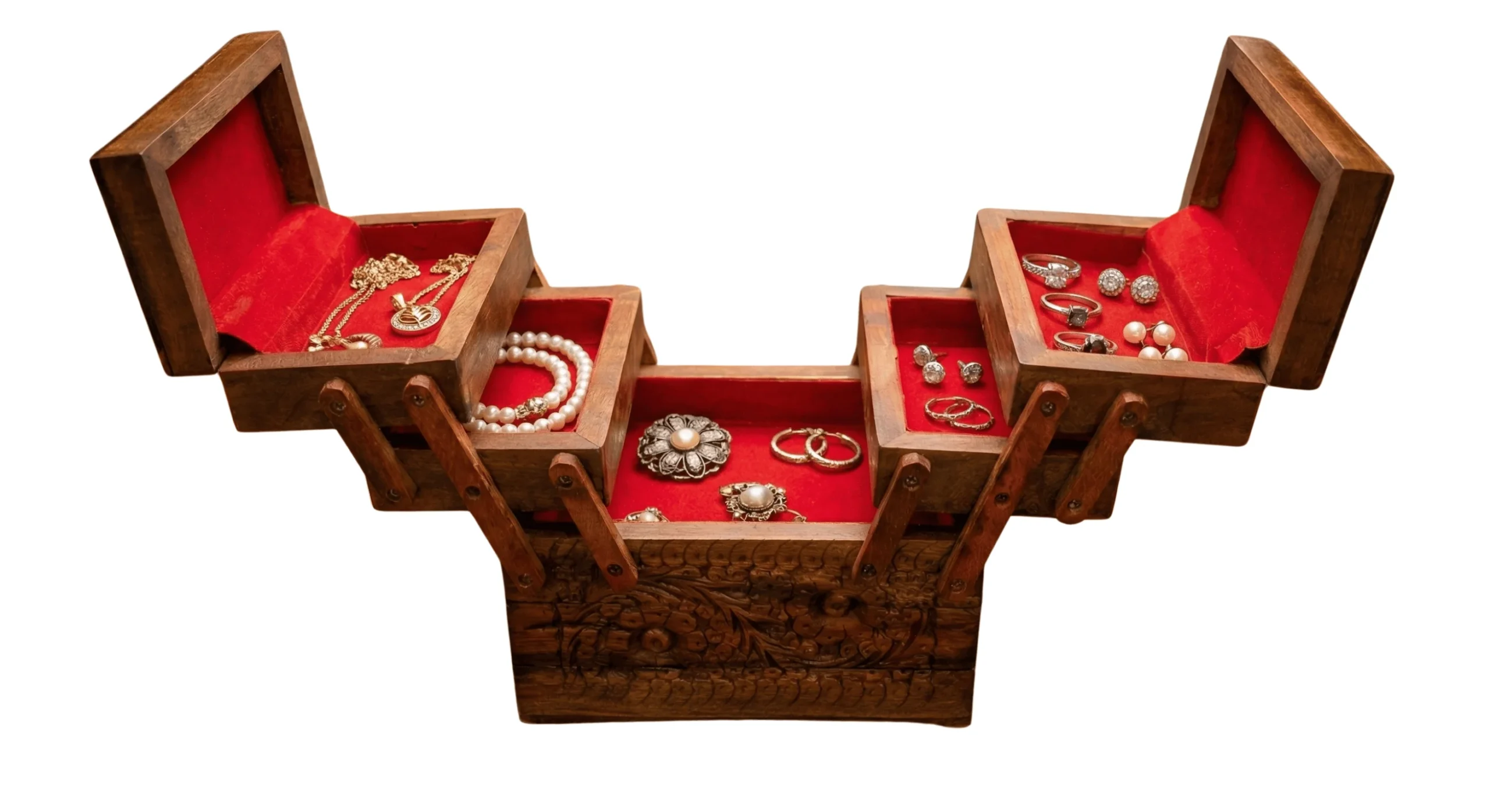 Cantilever Box, Wooden Jewelry Organizer, Sewing Box, Multi-Tier Storage, Velvet Lined Box, Hand Carved Chest, Vintage Organizer, Accordion Box.